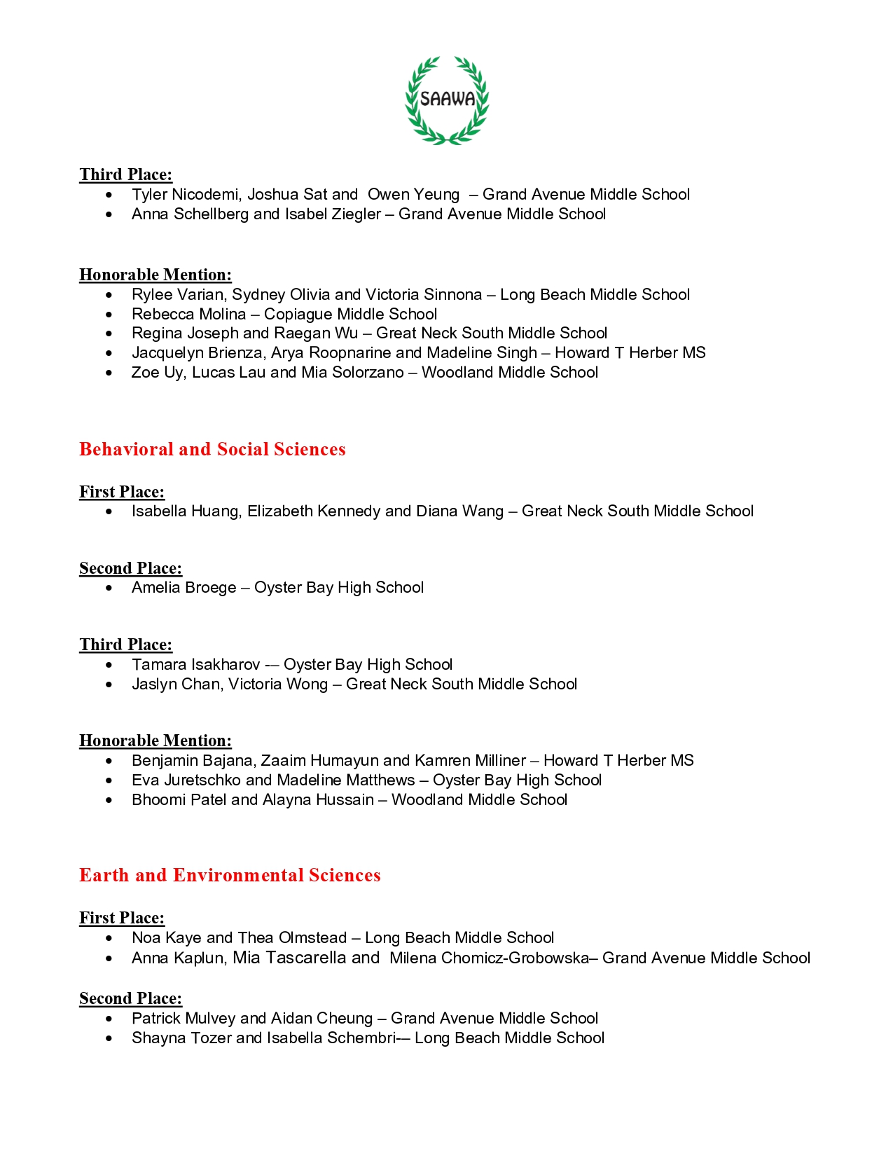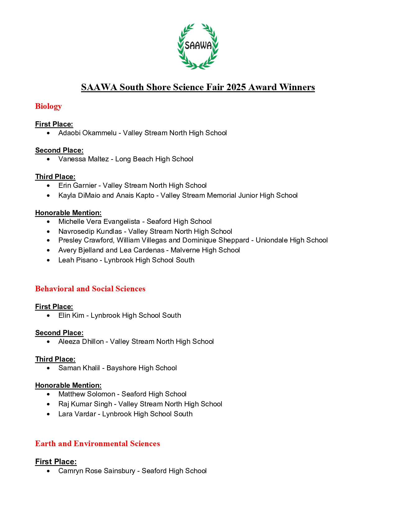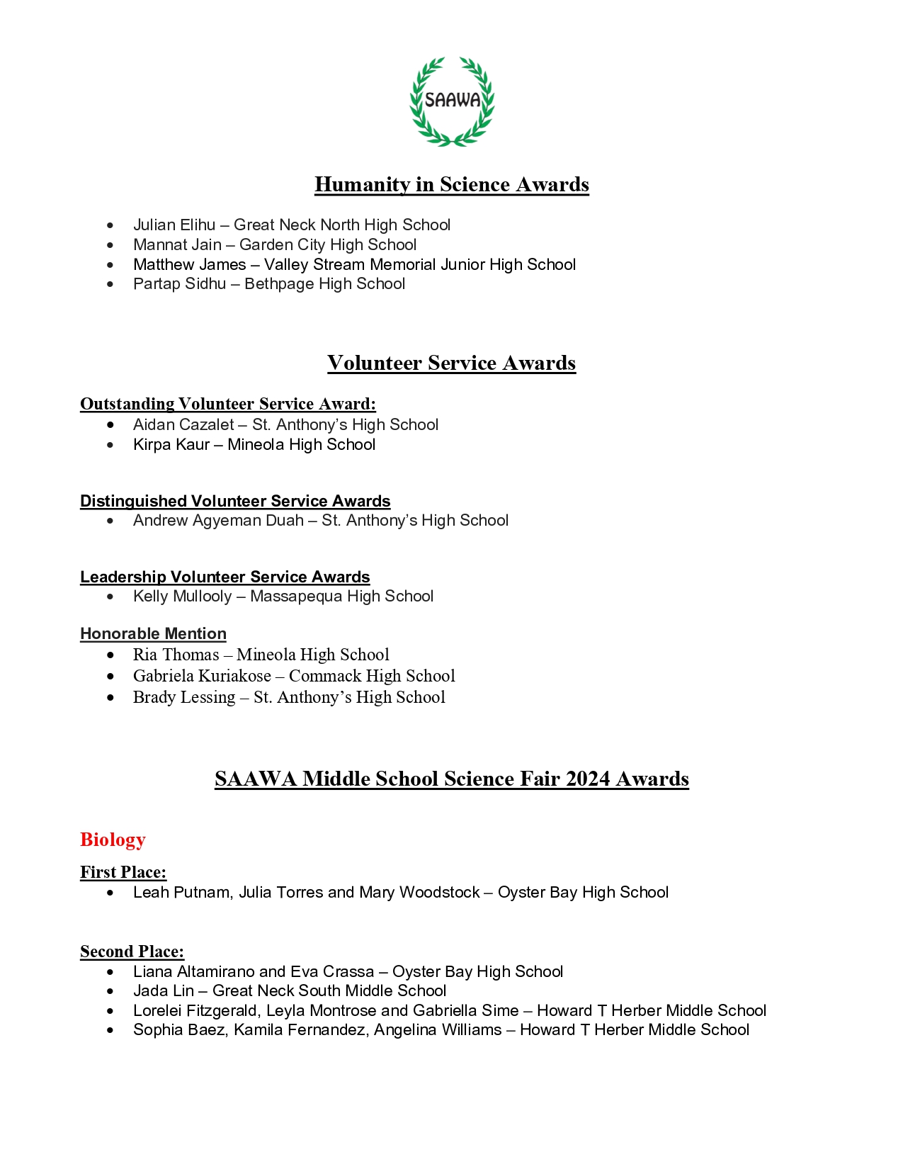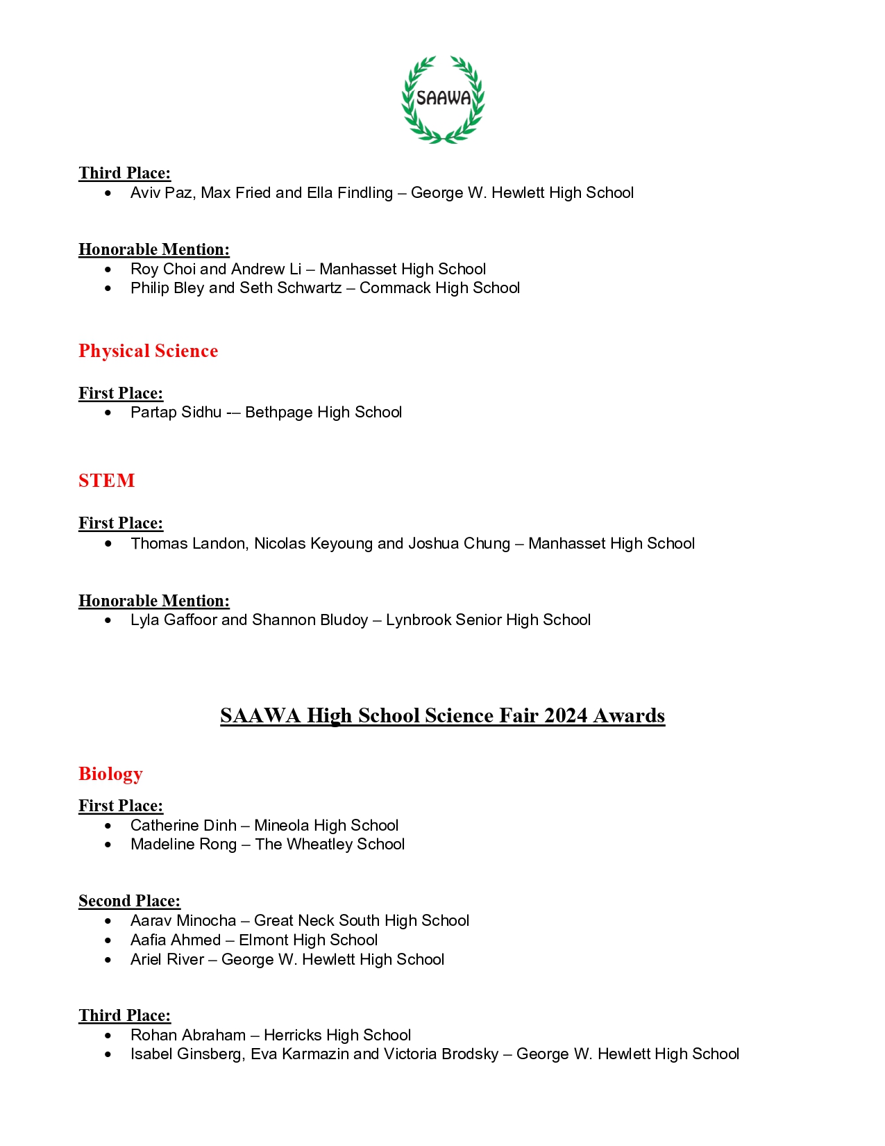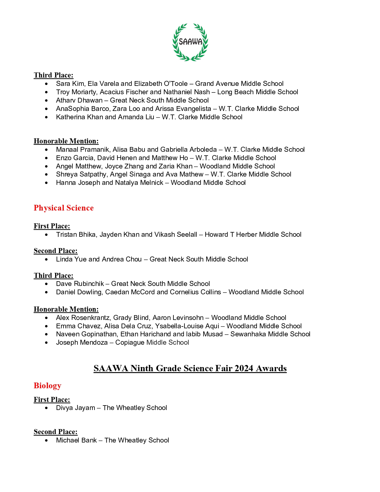 SAAWA Ninth Grade Science Fair 2024 Awards