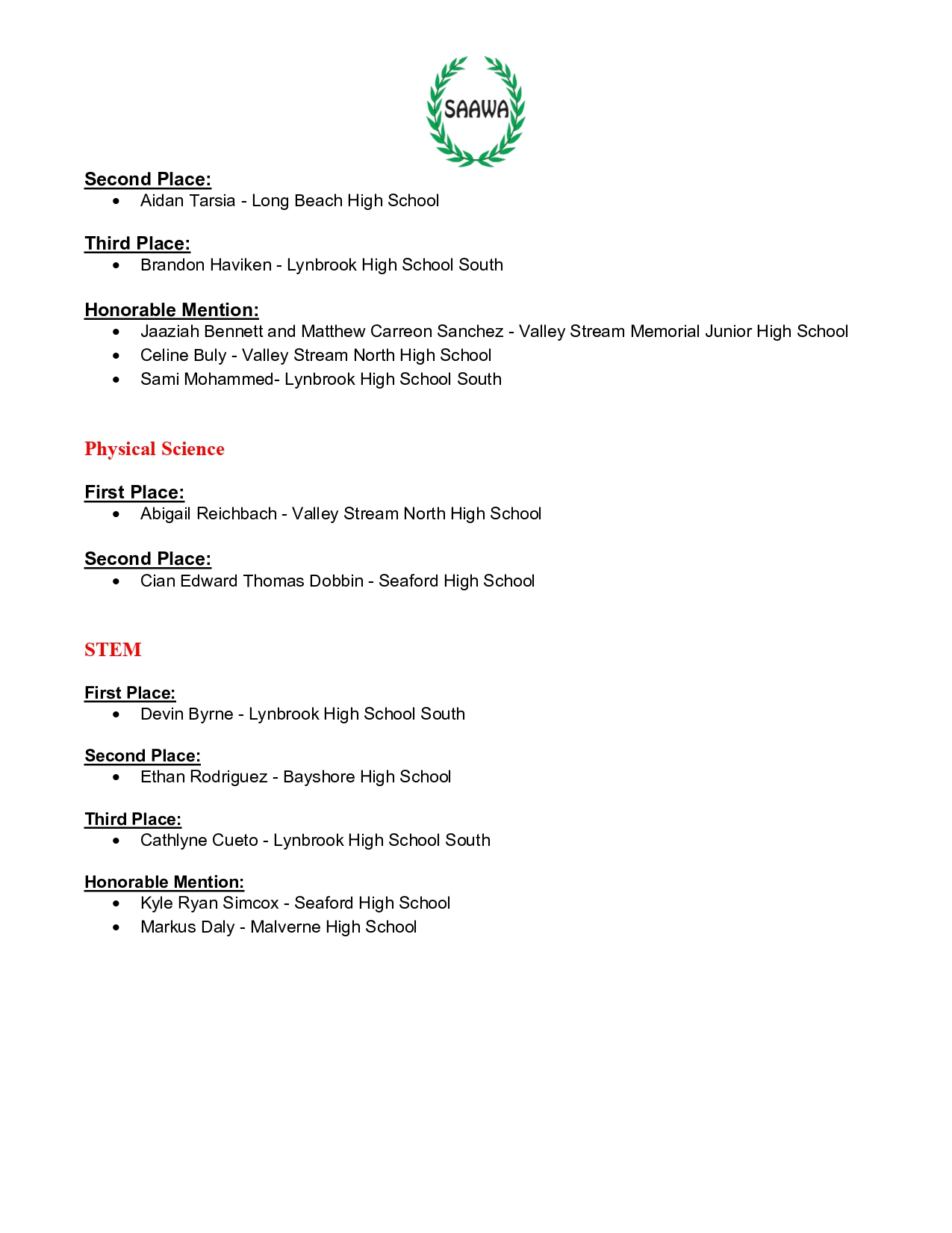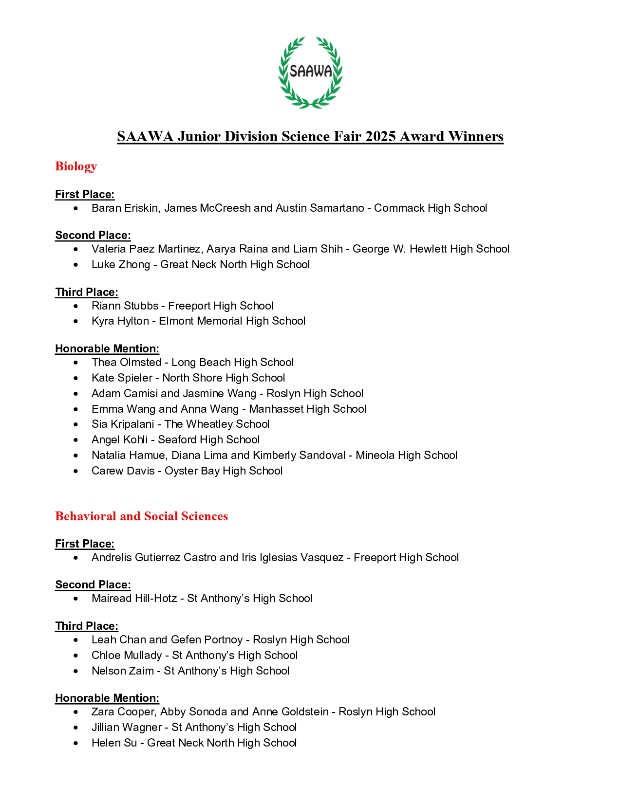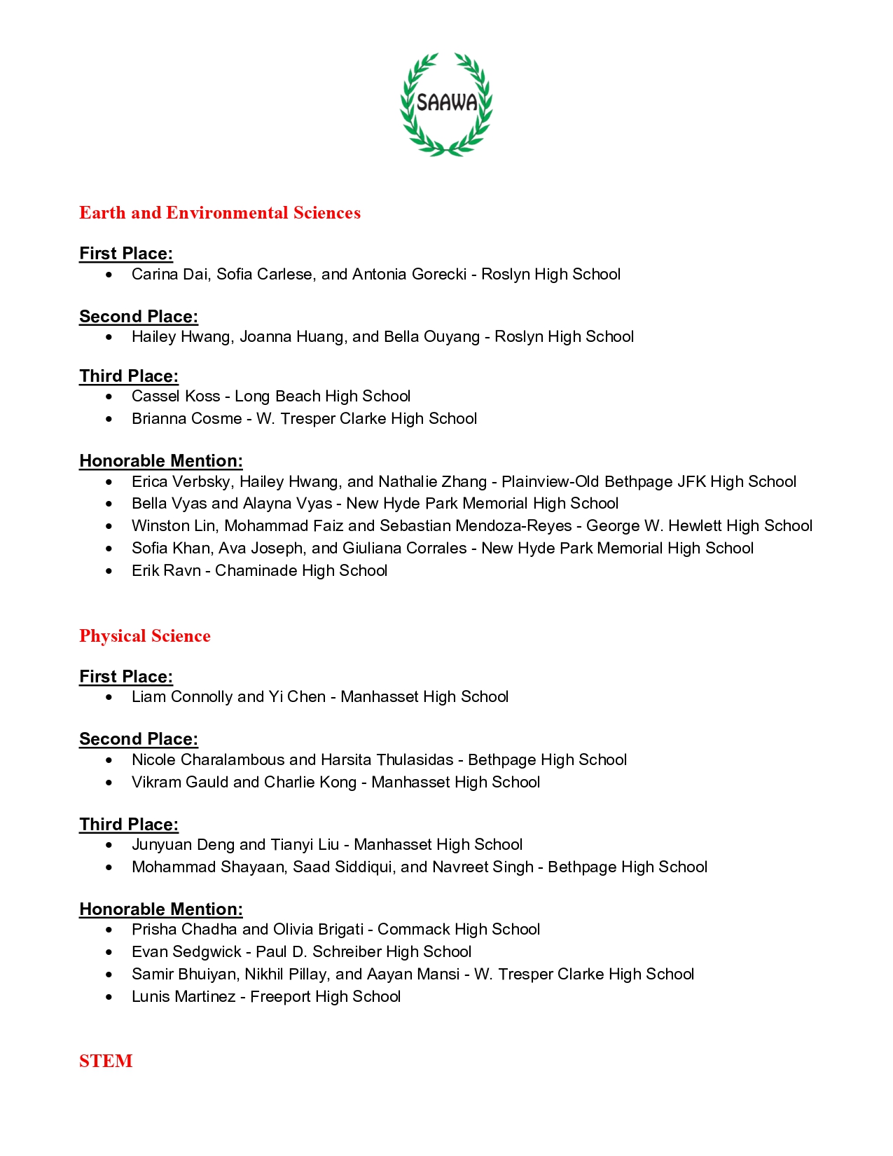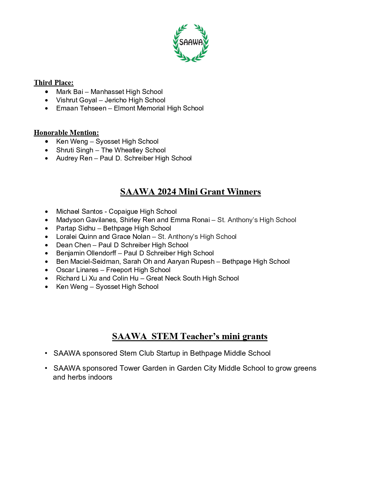 SAAWA Ninth Grade Science Fair 2024 Awards