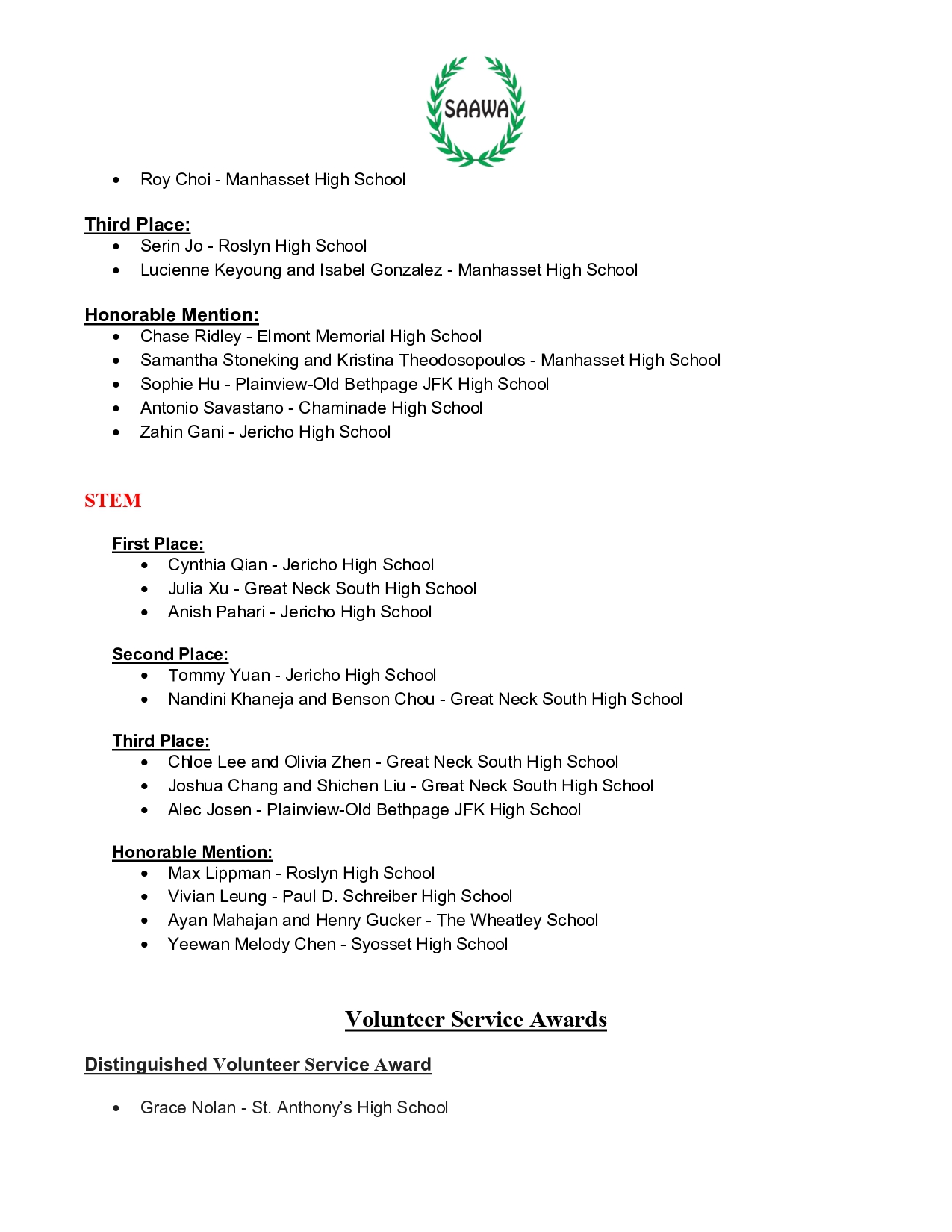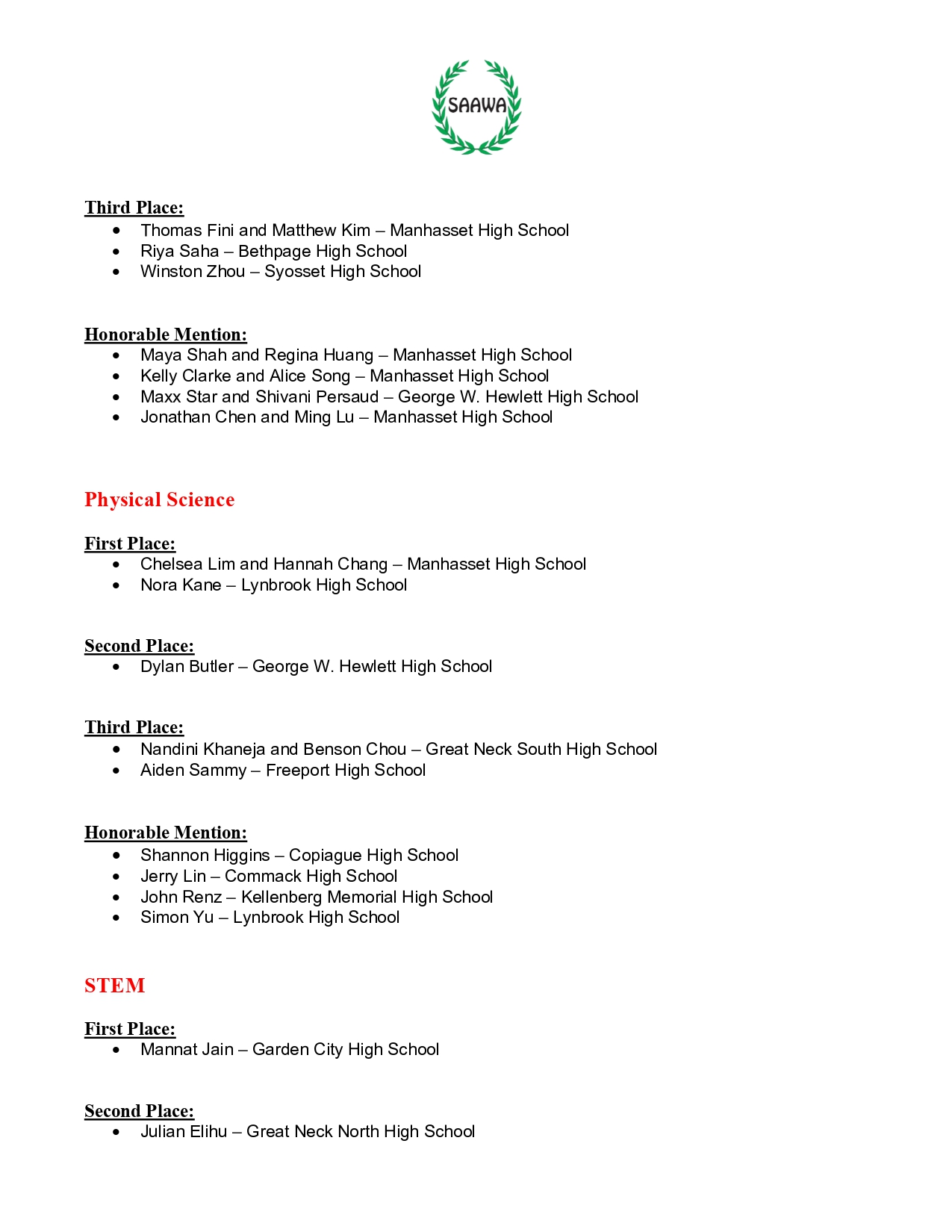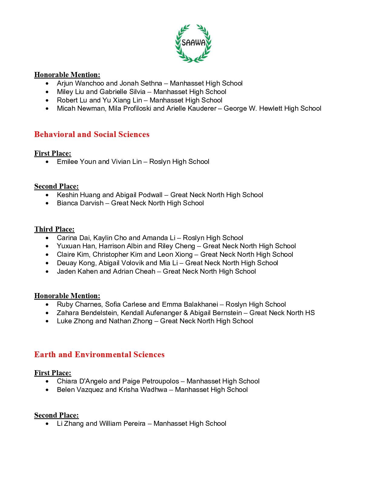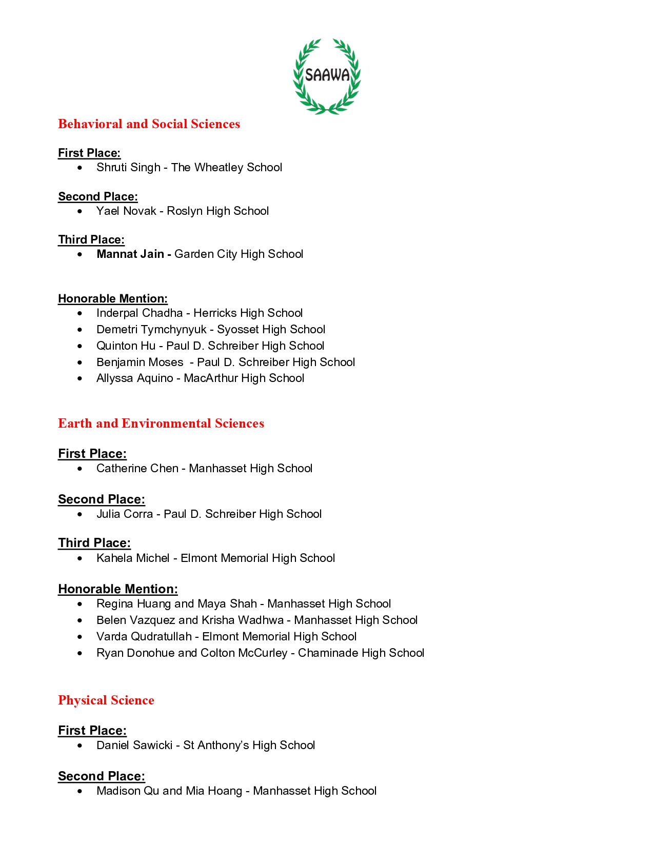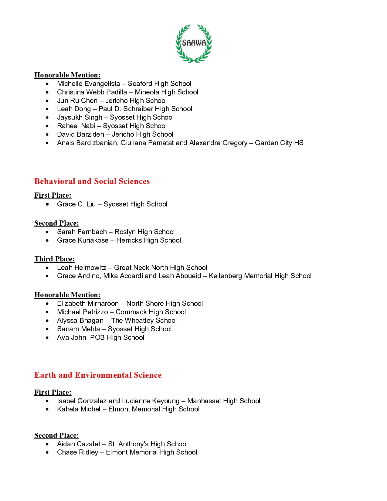 SAAWA Ninth Grade Science Fair 2024 Awards